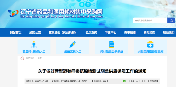 12月16日,為做好新型冠狀病毒抗原檢測試劑盒供應保障工作,遼寧省藥品和醫用耗材集中采購網發布了《關於做好新型冠狀病毒抗原檢測試劑盒供應保障工作的通知》。
