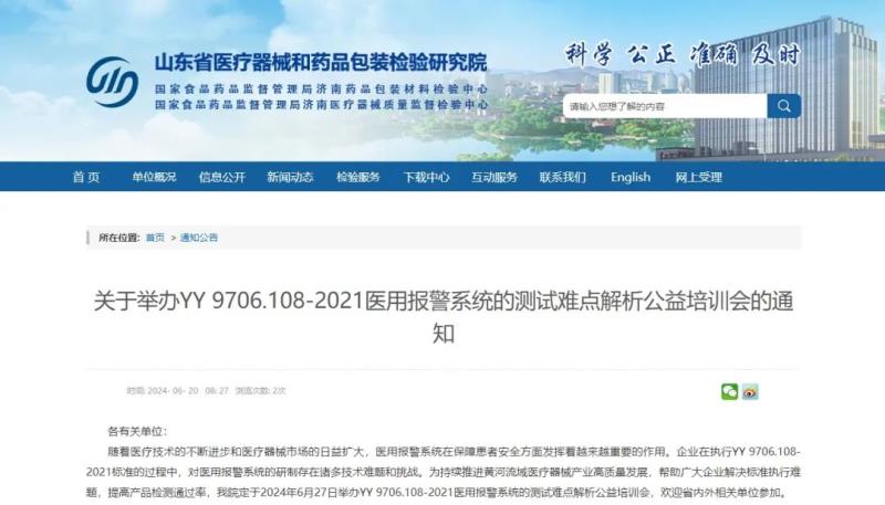 6月20日,山東省醫療器械和藥品包裝檢驗研究院發布通知稱,該院定於2024年6月27日舉辦YY 9706.108-2021醫用報警係統的測試難點解析公益培訓會,此次培訓為線上培訓,省內外相關單位均可報名參加。會議相關事宜具體如下: