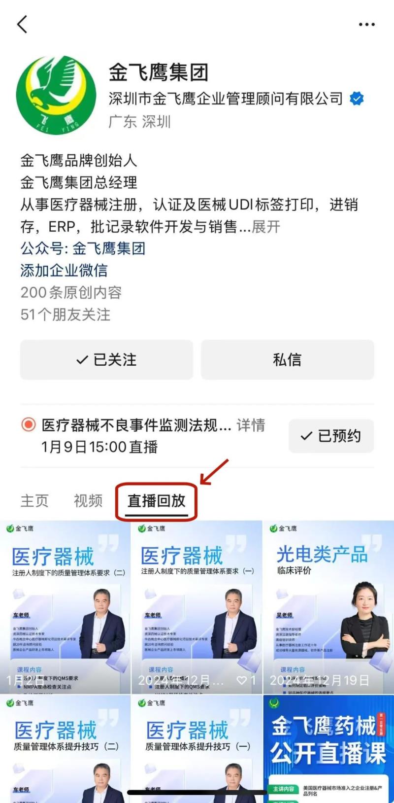 往期直播培訓課程支持回放,關注“金飛鷹藥械谘詢服務”視頻號並點擊視頻號主頁,即可查看“直播回放”哦~