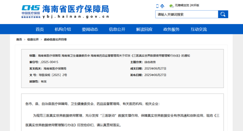 近日,海南省醫療保障局、海南省衛生健康委員會、海南省藥品監督管理局聯合印發《三醫真實世界數據使用管理暫行辦法》(以下簡稱《辦法》),自2025年8月1日起正式施行,有效期5年。作為國內首個明確整合醫療、醫保、醫藥(以下簡稱“三醫”)三方真實世界數據資源並規範其應用的管理文件,《辦法》的出台標誌著海南在利用真實世界證據支持藥械研發與評審、優化醫保決策方麵邁出關鍵一步。