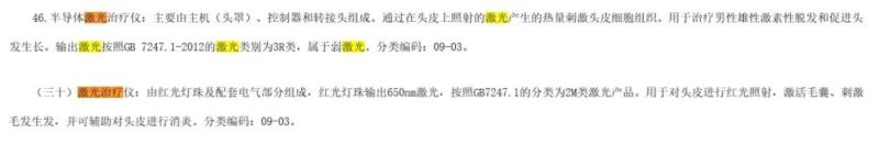 激光生發儀,主要通過在頭皮上照射的激光產生的熱量刺激頭皮細胞組織,用於刺激毛發生長,一般用的是2M類或3R類激光。國家藥監局醫療器械標準管理中心在《2018年醫療器械產品分類界定結果彙總》及《2023年第三次醫療器械產品分類界定結果彙總》中,分別對此類產品的預期用途及分類進行明確:作為第二類醫療器械管理,分類編碼09-03。產品的臨床評價方式為同品種對比。