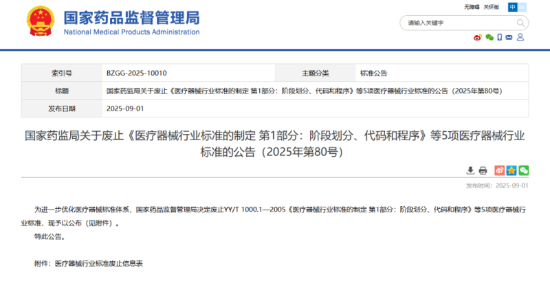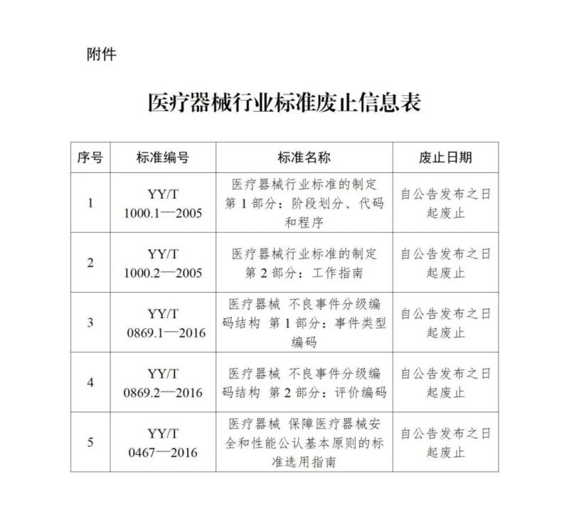 9月1日,國家藥監局發布一則公告稱,該局決定廢止YY/T 1000.1-2005《醫療器械行業標準的製定 第1部分:階段劃分、代碼和程序》、YY/T 0869.1-2016《醫療器械 不良事件分級編碼結構 第1部分:事件類型編碼》等5項醫療器械行業標準,具體明細如下:
