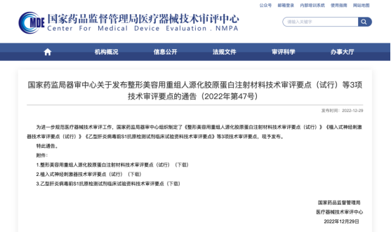12月29日,國家藥監局器審中心發布《整形美容用重組人源化膠原蛋白注射材料技術審評要點(試行)》《植入式神經刺激器技術審評要點(試行)》《乙型肝炎病毒前S1抗原檢測試劑臨床試驗資料技術審評要點》3項技術審評要點。