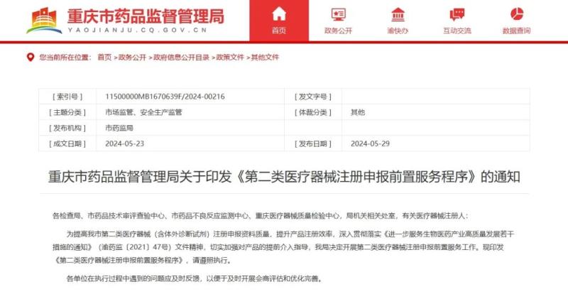 為提高我市第二類醫療器械(含體外診斷試劑)注冊申報資料質量,提升產品注冊效率,深入貫徹落實《進一步服務生物醫藥產業高質量發展若幹措施的通知》(渝藥監〔2021〕47號)文件精神,切實加強對產品的提前介入指導,我局決定開展第二類醫療器械注冊申報前置服務工作。