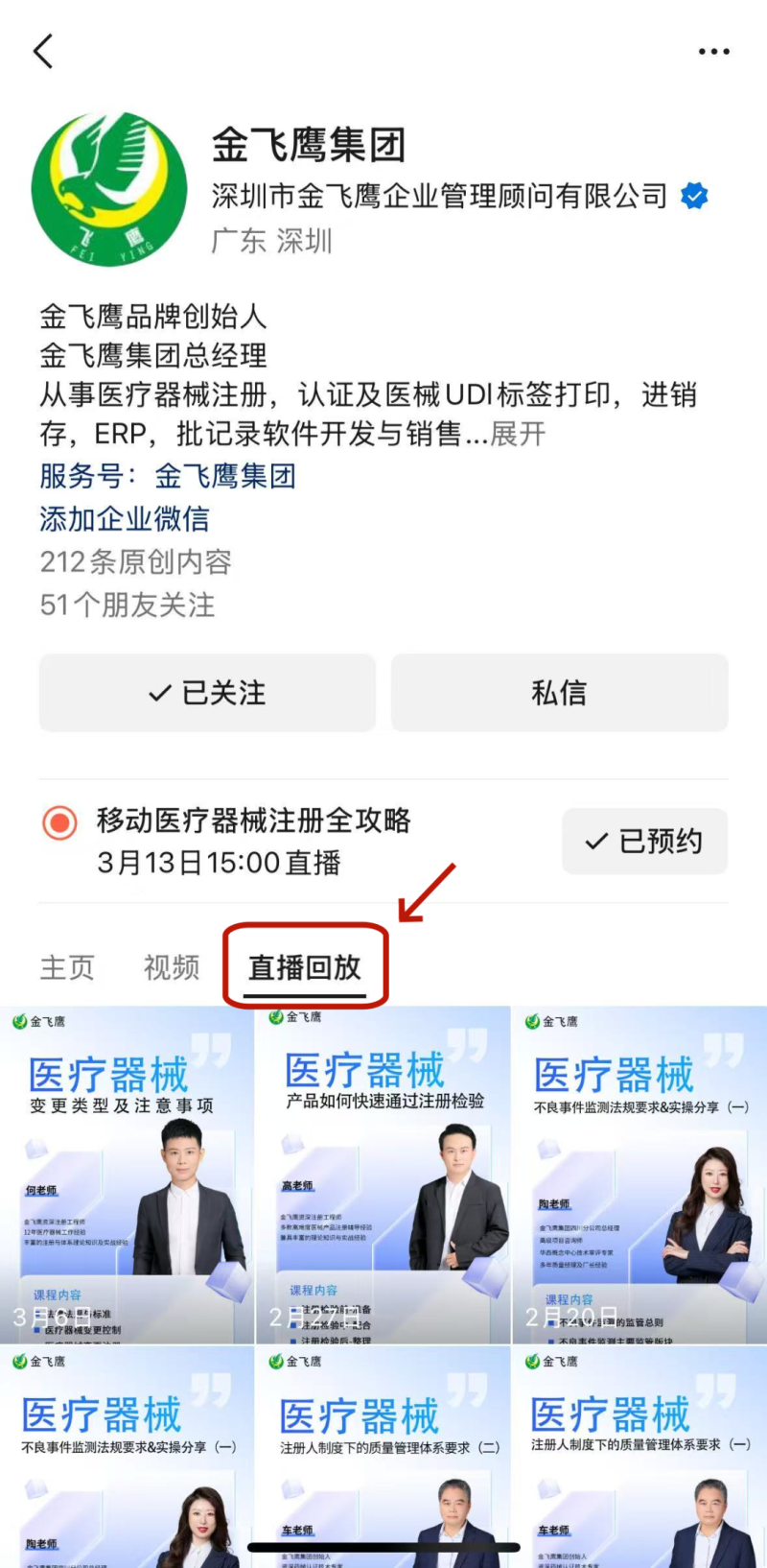 往期直播培訓課程支持回放,關注“金飛鷹藥械谘詢服務”視頻號並點擊視頻號主頁,即可查看“直播回放”哦~