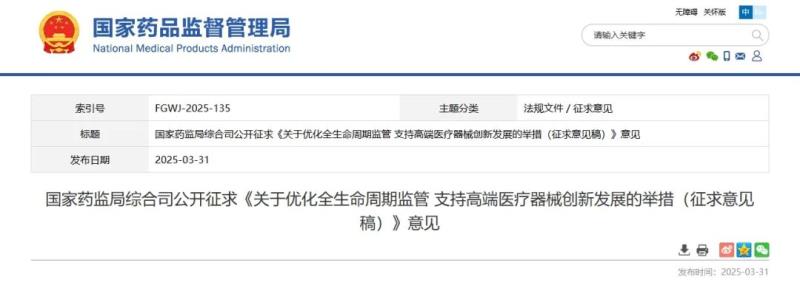 3月31日,國家藥監局發布《關於優化全生命周期監管支持高端醫療器械創新發展的舉措(征求意見稿)》(以下簡稱《舉措》),從多方麵提出支持舉措,全力推動高端醫療器械的創新與發展,現向社會公開征求意見。