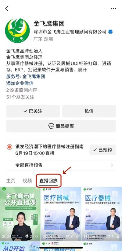 往期直播培訓課程支持回放,關注“金飛鷹藥械谘詢服務”視頻號並點擊視頻號主頁,即可查看“直播回放”哦~