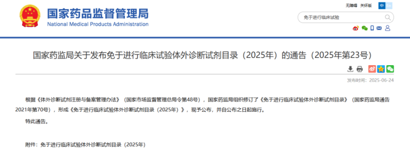 6月24日,國家藥監局發布《免於進行臨床試驗體外診斷試劑目錄(2025年)》(以下簡稱“2025年目錄”),共有445類IVD產品可免於臨床試驗,其中Ⅲ類產品27種,Ⅱ類產品418種。我們通過與《免於臨床試驗體外診斷試劑目錄(2021年)》進行簡單對比,2025年目錄中新增的免於臨床試驗產品大概有這些(可能會有疏漏,歡迎指正):