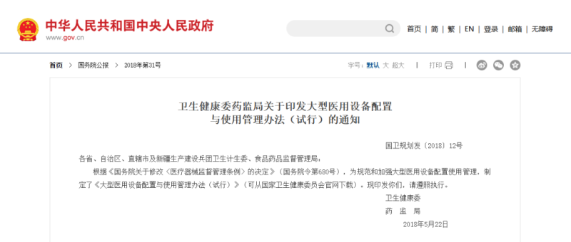 根據《大型醫用設備配置與使用管理辦法(試行)》,大型醫用設備,是指使用技術複雜、資金投入量大、運行成本高、對醫療費用影響大且納入目錄管理的大型醫療器械。