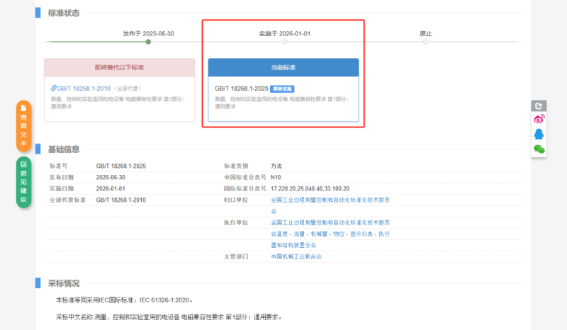 據全國標準信息公共服務平台近日公布,GB/T 18268.1-2025《測量、控製和實驗室用的電設備 電磁兼容性要求 第1部分:通用要求》推薦性國家標準批準發布,該標準即將替代GB/T 18268.1-2010,於2026年1月1日起正式實施。據悉,該標準等同采用IEC國際標準:IEC 61326-1:2020。
