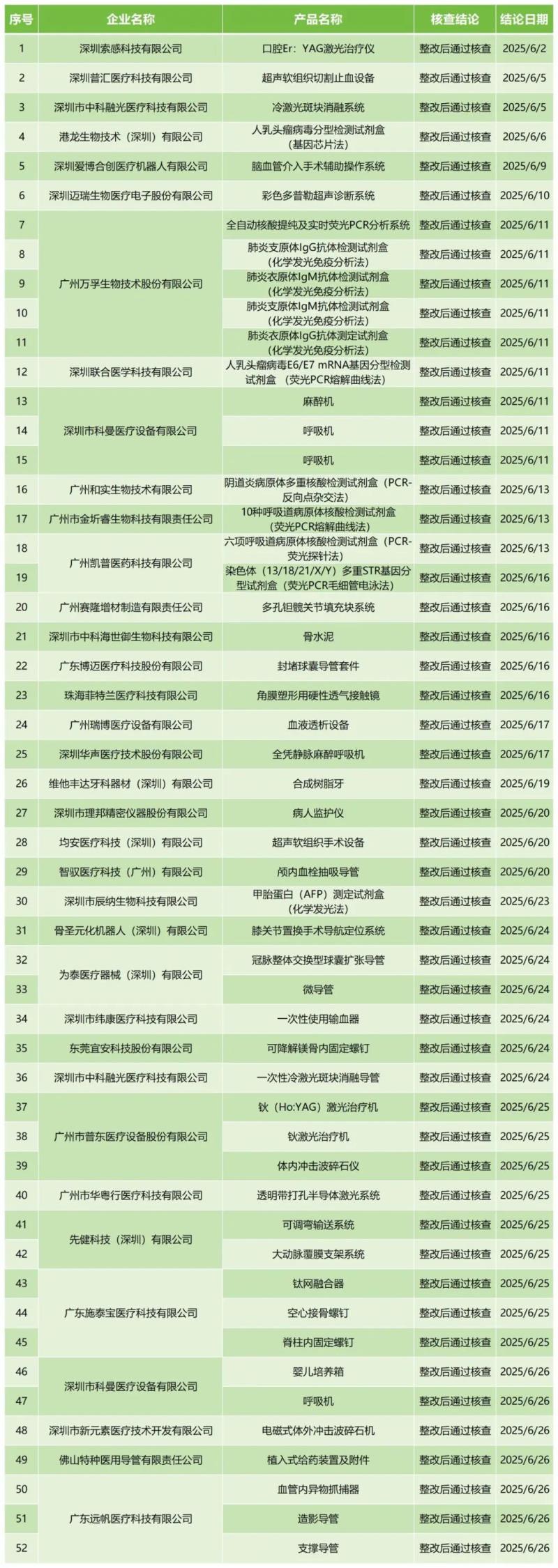 7月16日,廣東省藥監局官網公布2025年6月醫療器械注冊質量管理體係核查結果,包括深圳索感科技有限公司的口腔Er:YAG激光治療儀、廣州萬孚生物技術股份有限公司的全自動核酸提純及實時熒光PCR分析係統、廣州市普東醫療設備股份有限公司的鈥(Ho:YAG)激光治療機、深圳市科曼醫療設備有限公司的呼吸機等共計52款產品,均為“整改後通過核查”。具體明細見下方表格:
