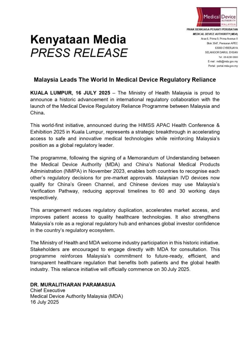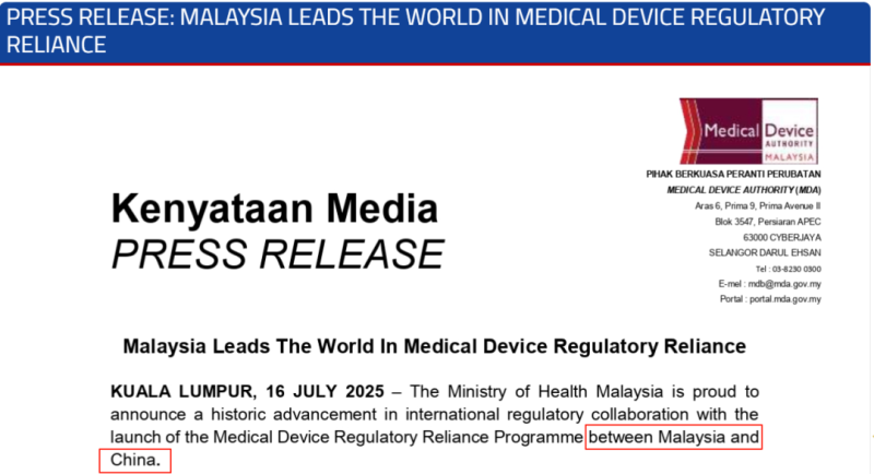 據悉,該計劃基於2023年11月馬來西亞MDA與中國NMPA簽署的諒解備忘錄(MOU),使兩國能夠相互認可對方的上市前審批決定。