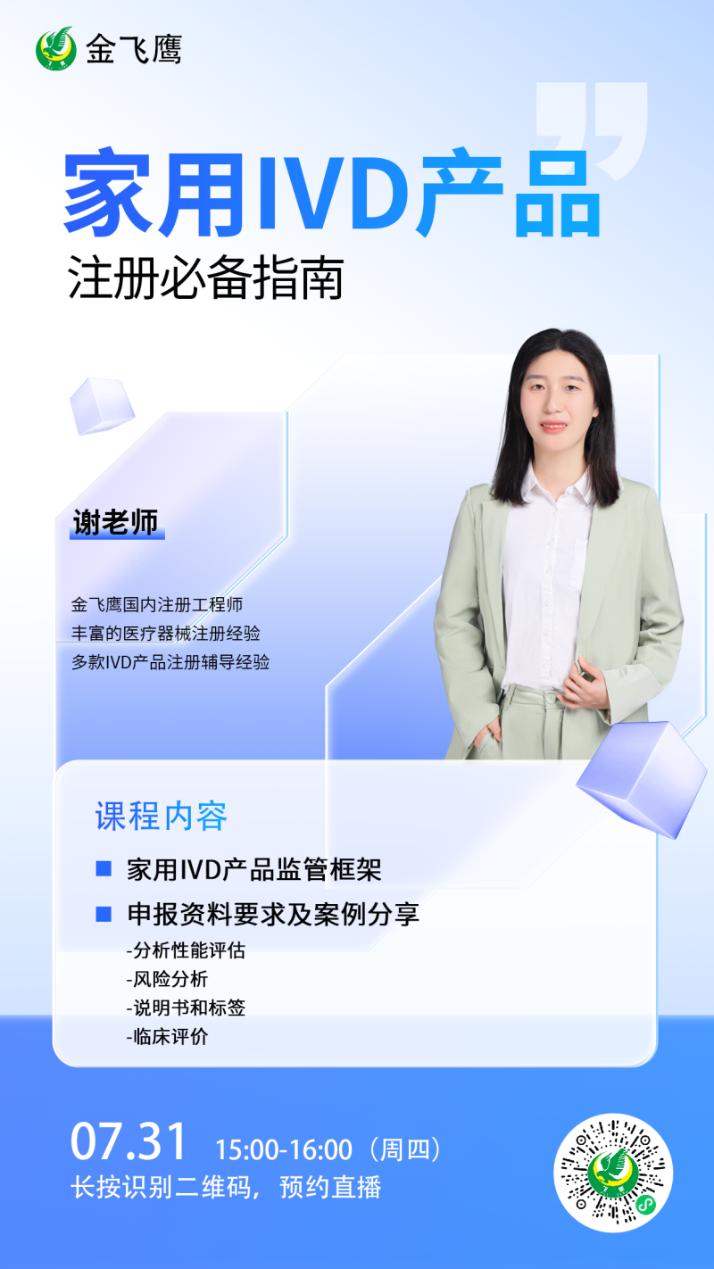 7月31日下午3點,金飛鷹國內注冊工程師、有著多款IVD產品注冊輔導經驗的謝老師給大家帶來《家用IVD產品注冊必備指南》,她將結合具體案例,拆解分析性能評估(如何確保性能不會受到非專業檢測環境的明顯影響)、說明書標簽設計(防誤操作警示標識設置)等關鍵環節,手把手指導企業規避高頻發補風險。這場培訓將為您揭開家用IVD注冊的“隱形門檻”,助力產品快速獲批、搶占市場先機,感興趣的朋友記得提前預約!
