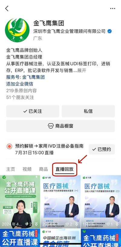 往期直播培訓課程支持回放,關注“金飛鷹藥械谘詢服務”視頻號並點擊視頻號主頁,即可查看“直播回放”哦~