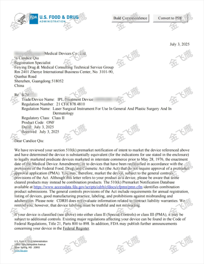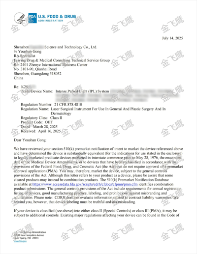 關注我們的朋友想必已經注意到,我們在脫毛儀510(k)注冊領域的成就同樣極為亮眼。由於成功案例實在太多,很多新取得的K號甚至都來不及一一宣傳。值此機會,我們特別精選兩張今年7月新出的K號與大家分享,更多脫毛儀510(k)成功案例,歡迎點擊右側鏈接查看☞IPL脫毛儀510(k)。