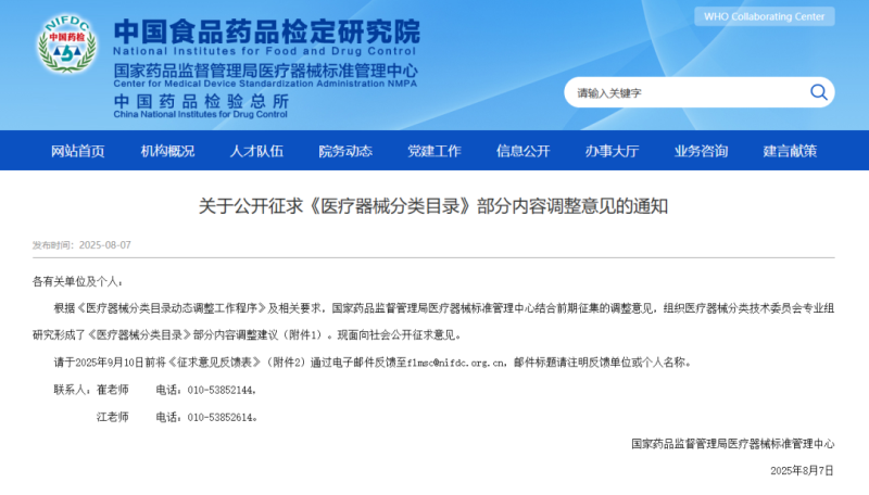 8月7日,國家藥品監督管理局醫療器械標準管理中心發布《醫療器械分類目錄》部分內容調整建議,並向社會公開征求意見。