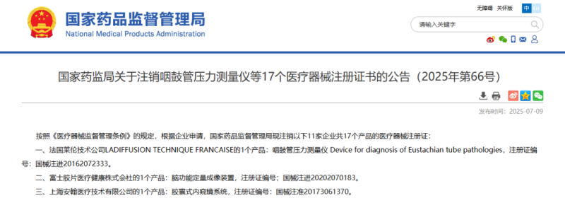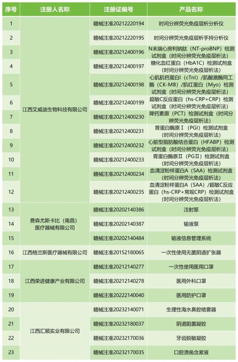 近日,江西省藥監局發布一則醫療器械注冊證注銷公告,公告顯示,該局已依法注銷江西艾威迪生物科技有限公司、費森尤斯卡比(南昌)醫療器械有限公司、江西榮進健康產業有限公司等5家企業共計23個產品的醫療器械注冊證,包括時間分辨熒光免疫層析分析儀、輸液泵、注射泵、牙齒脫敏凝膠等產品,具體明細如下: