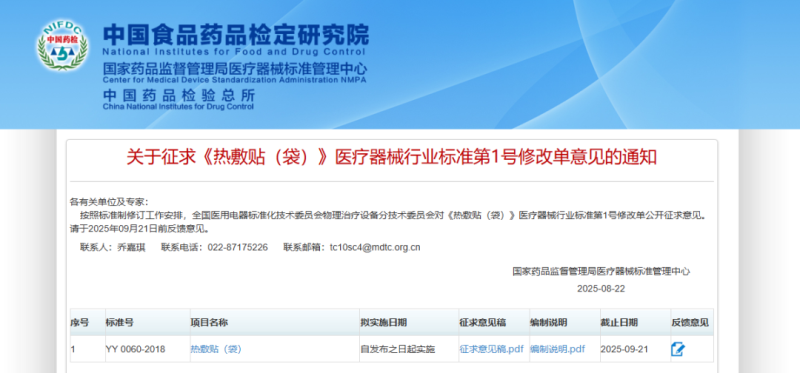 近日,國家藥監局醫療器械標管中心發布YY 0060-2018《熱敷貼(袋)》醫療器械行業標準第1號修改單,並向社會公開征求意見。